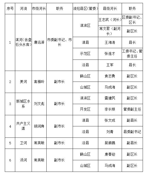 根据《中共鹤壁市委办公室鹤壁市人民政府办公室关于印发<鹤壁市全面推行河长制工作方案>的通知》(鹤办文〔2017〕14号),市级河长负责的河流所经县区的河段,其河长名单由市河长制办公室公布。现将鹤壁市第一总河长、总河长、副总河长、市级河长及市级河长负责的河流所经县区的河长名单予以公布。