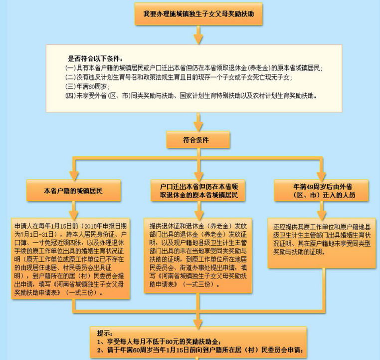 (一)具有本省户籍的城镇居民或户口迁出本省但仍在本省领取退休金(养老金)的原本省城镇居民; (二)没有违反计划生育号召和政策法规生育且目前现存一个子女或子女死亡现无子女; (三)年满60周岁; (四)未享受外省(区、市)同类奖励与扶助、国家计划生育特别扶助以及农村计划生育奖励扶助。 |